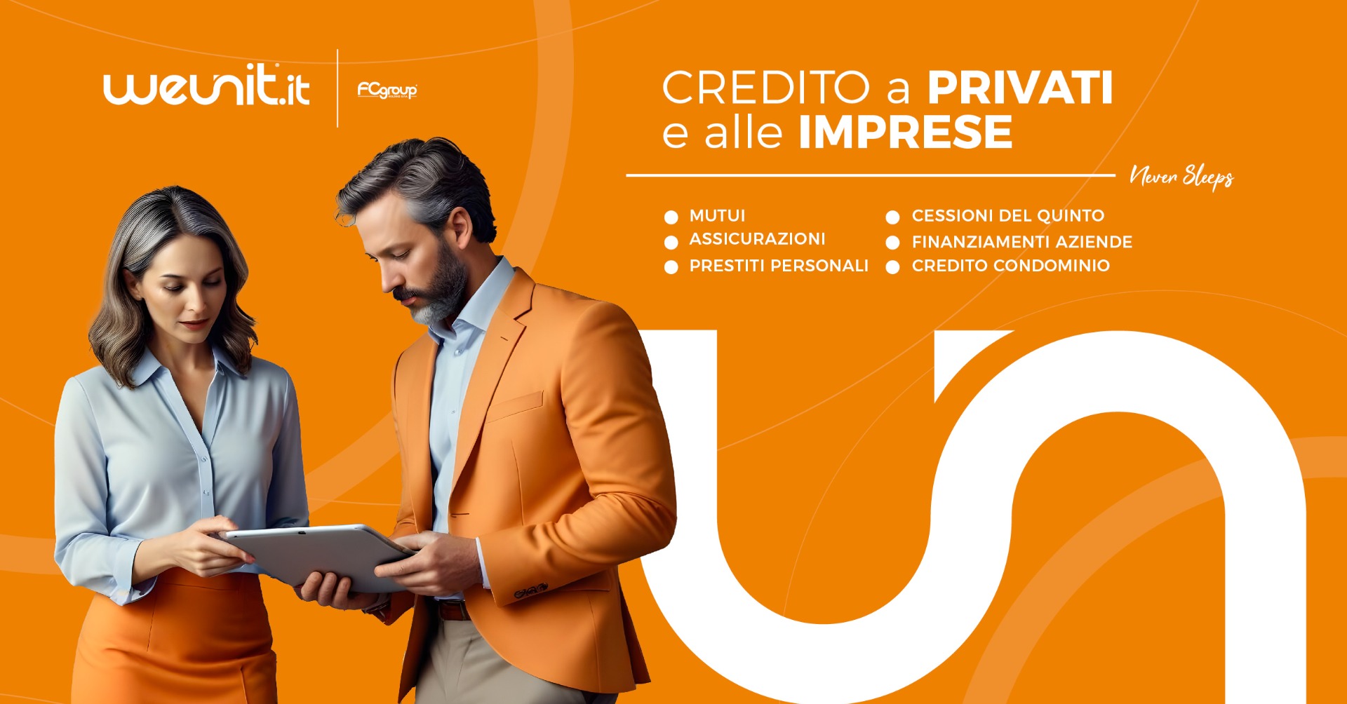 Con una rete di oltre 470 professionisti del credito esperti e qualificati, WeUnit.it è pronta a rispondere ad ogni tua esigenza finanziaria, offrendo un'ampia gamma di servizi che coprono tutto il panorama del credito: mutui, prestiti personali, cessioni del quinto e finanziamenti alle imprese.